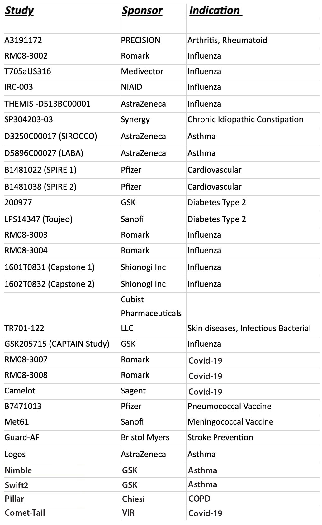 | Study | Sponsor | Indication |